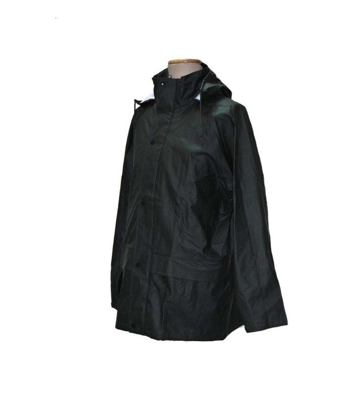 Kurtka przeciwdeszczowa z kapturem wykonana z elastycznego poliuretanu. Części kurtki łączone są w bardzo wytrzymały sposób za pomocą szycia i dodatkowo zgrzania.