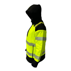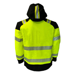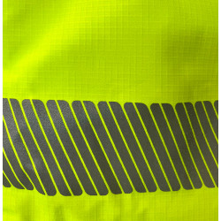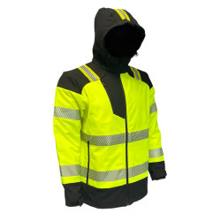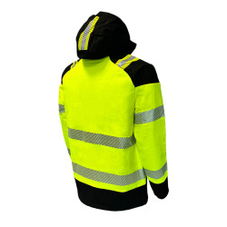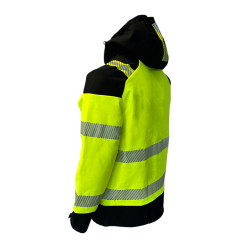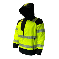 * Kolorystyka: Dominujący kolor to intensywny, żółty fluorescencyjny, idealny do pracy w warunkach ograniczonej widoczności. Czarne wstawki na ramionach, kapturze, mankietach oraz u dołu kurtki nadają całości estetyczny i trwały charakter.